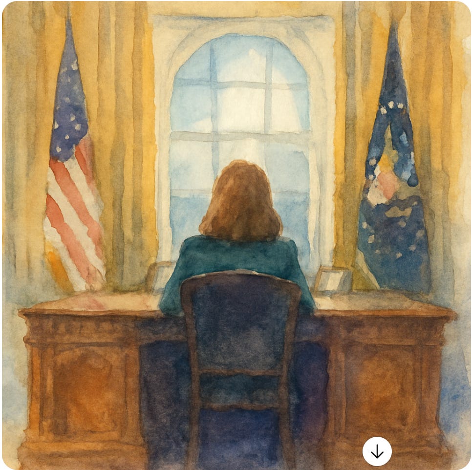 In my dream, I and others were helping her assemble an extraordinary, leading-edge cabinet. She was moving boldly forward on so many fronts, everything described above and much more — visionary shifts in how we organize society so that it serves everyone, heals what's broken, and repairs what's been ignored. I could viscerally feel the magic of what was happening in my bones. It felt inspiring, sweet and true.